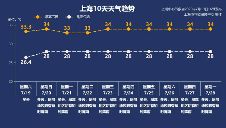 今天入伏后,上海处于副热带高压南部边缘,下周主要受偏东气流影响,申城多阵雨天气。最高气温维持在33-34℃,最低气温在28℃左右。